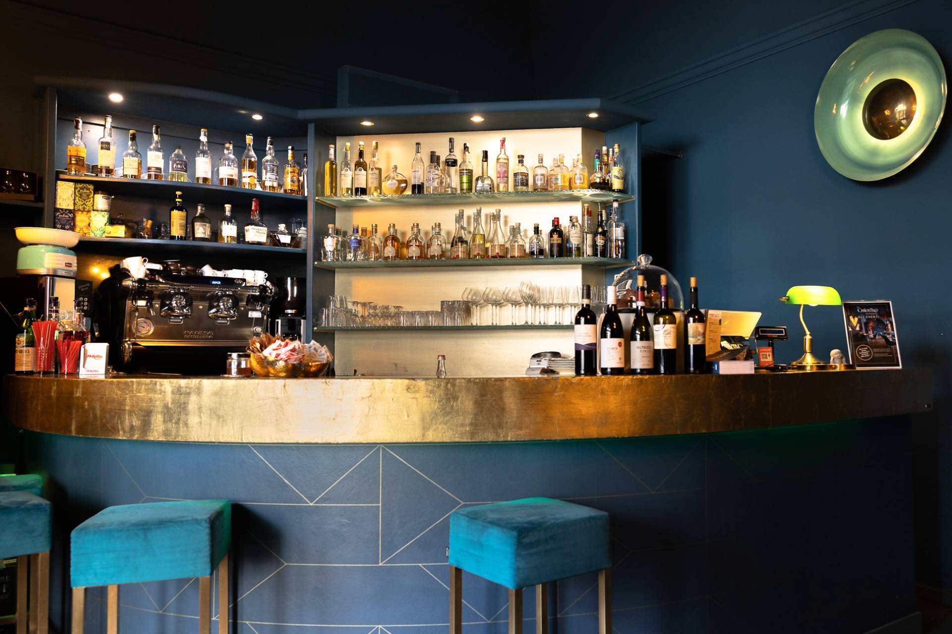 Ingresso con bancone bar che conduce alla sala principale elegantemente rifinita con ornamenti di arredo che dispone di 4 vetrine con affaccio sull'affascinante chiostro che caratterizza il ristorante.