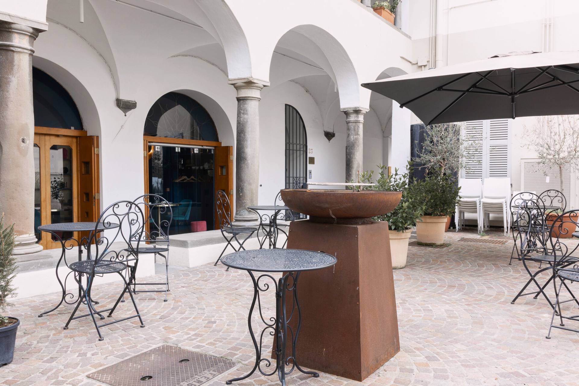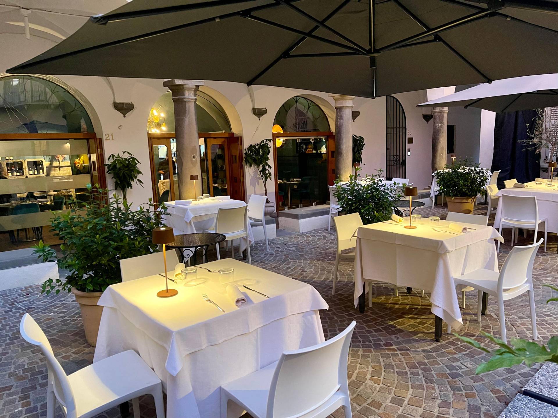 Il ristorante ha una capienza intima e riservata di 28 coperti che aumentano con l'utilizzo della seconda saletta e del Dehor situato nel cuore del chiostro.