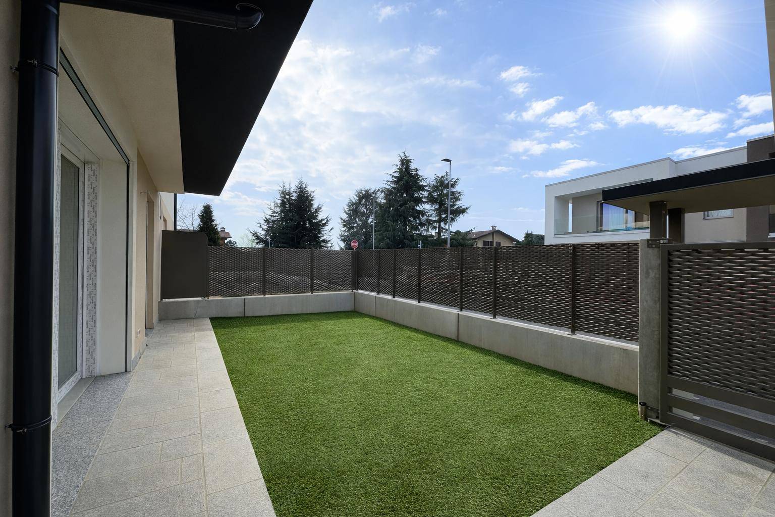 L'ingresso privato accede dal giardino e percorrendo al vialetto si arriva al portoncino blindato d'ingresso.