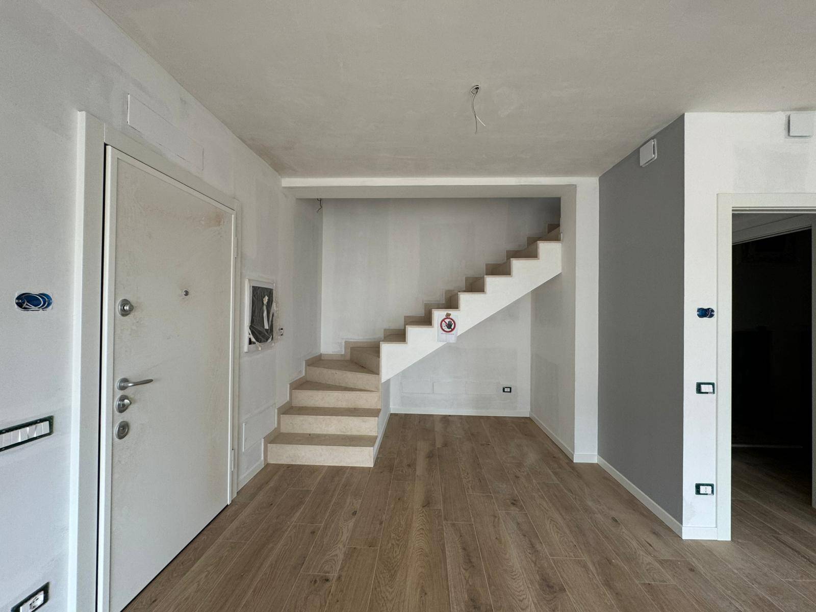 Il piano terra è composto dall'ampia zona giorno con accesso tramite vetrata al giardino privato, sempre al piano terra troviamo il bagno e le comode scale che conducono al primo piano.