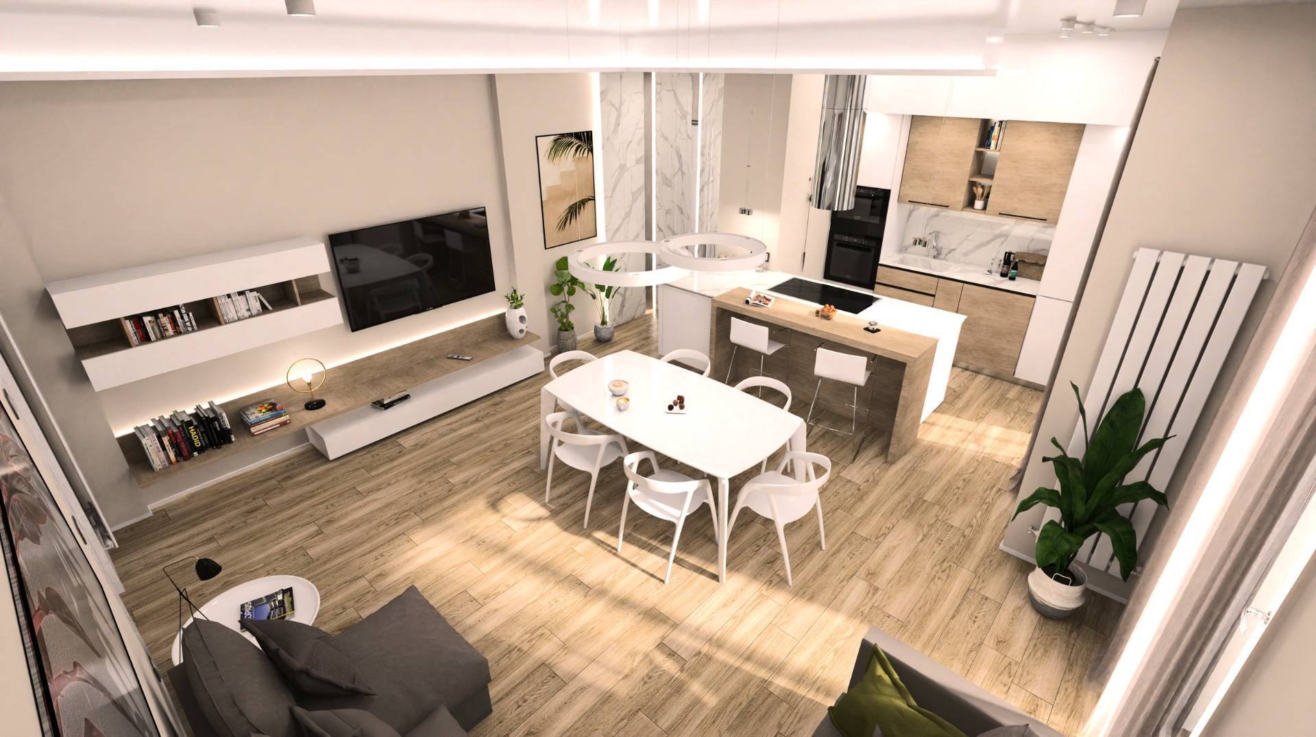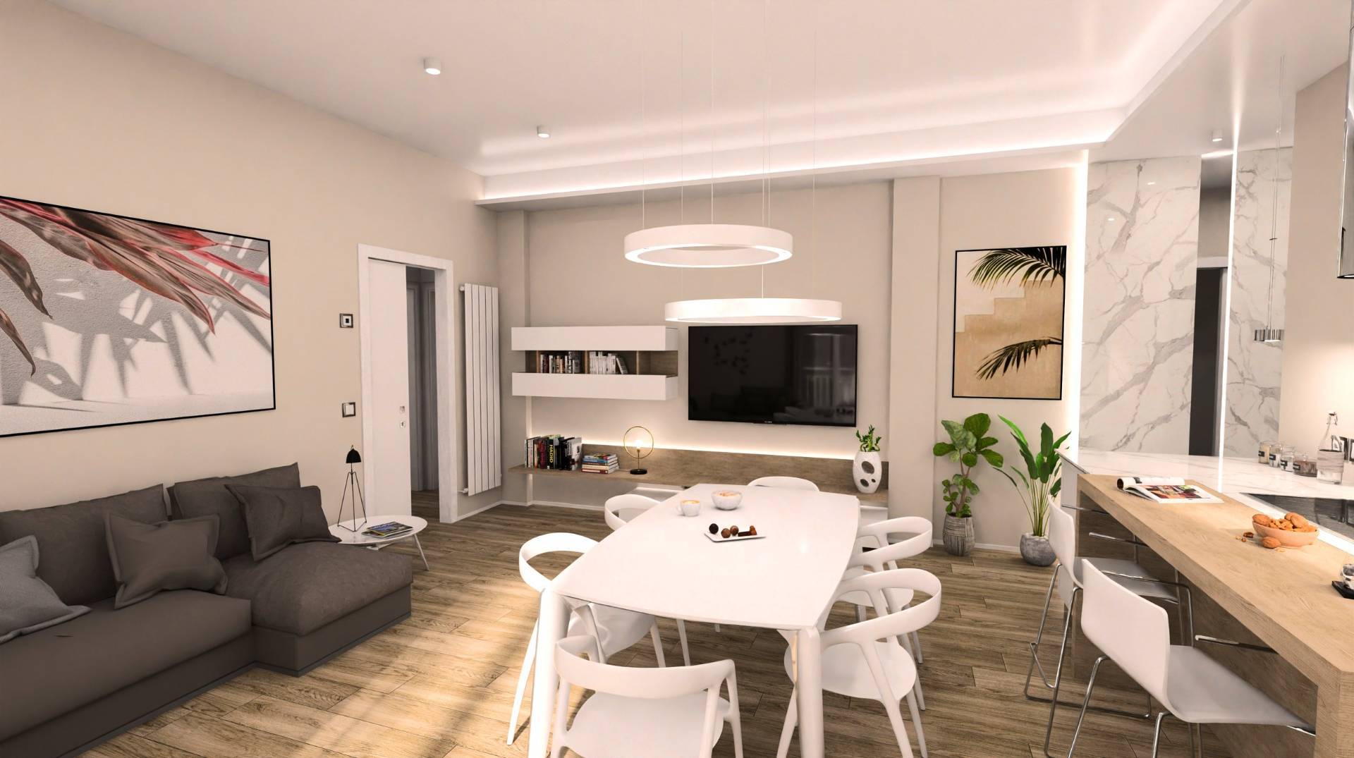 La zona giorno accoglie con un open-space arioso e contemporaneo, in cui la cucina moderna si unisce al soggiorno in un connubio perfetto di eleganza e praticità, pensato per chi ama vivere la casa in ogni suo momento.