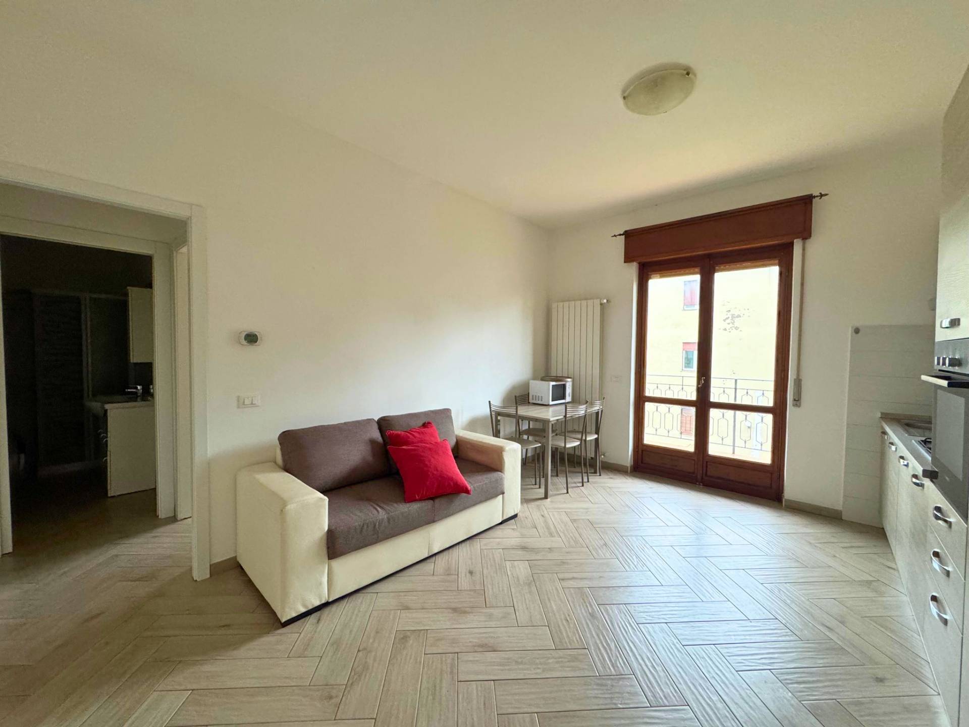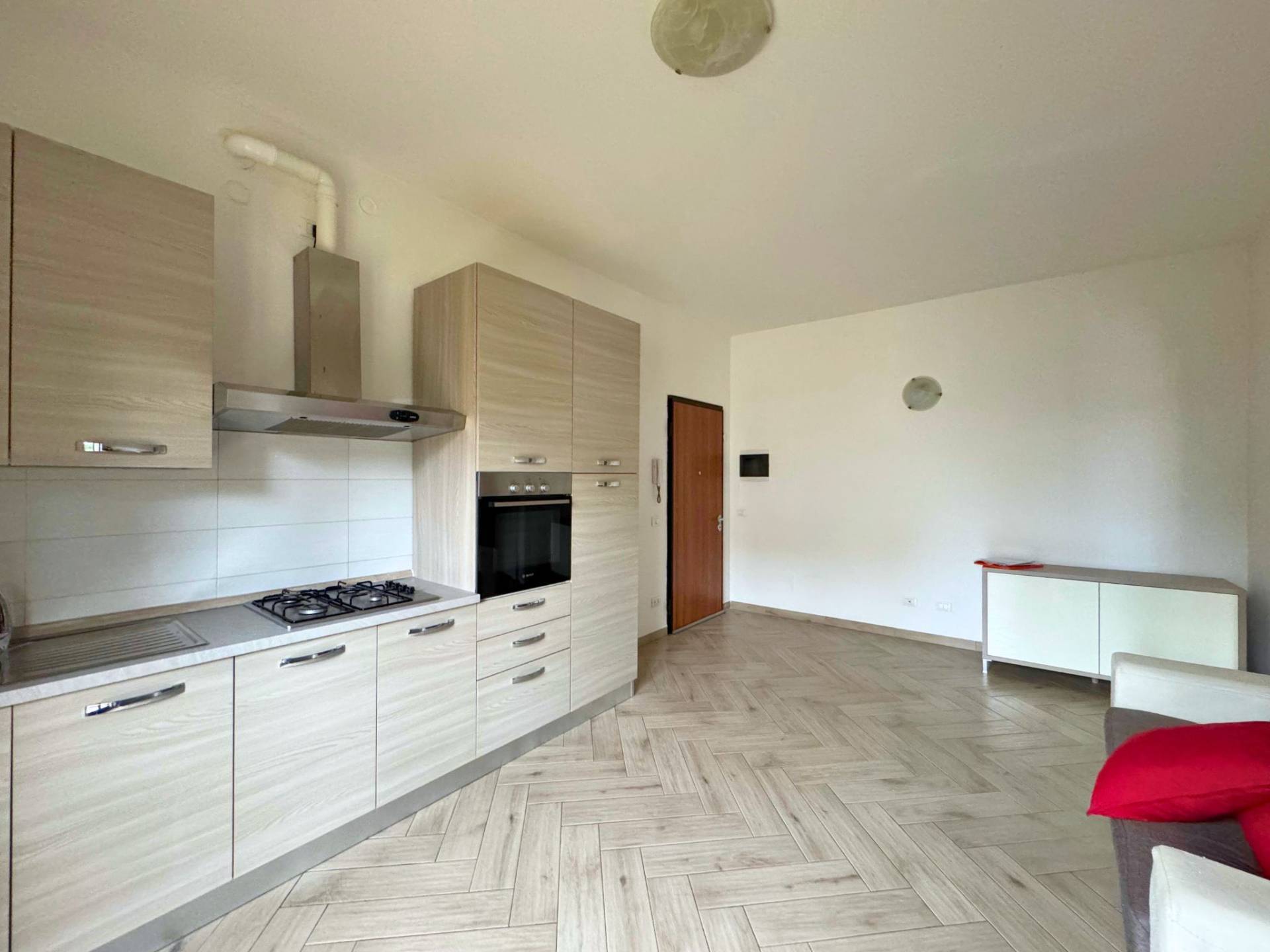 L'appartamento è composto dalla sala con cucina open space dal quale abbiamo un comodo accesso al terrazzo che affaccia sul giardino privato, abbastanza profondo per mangiare fuori d'estate e prendere il sole.