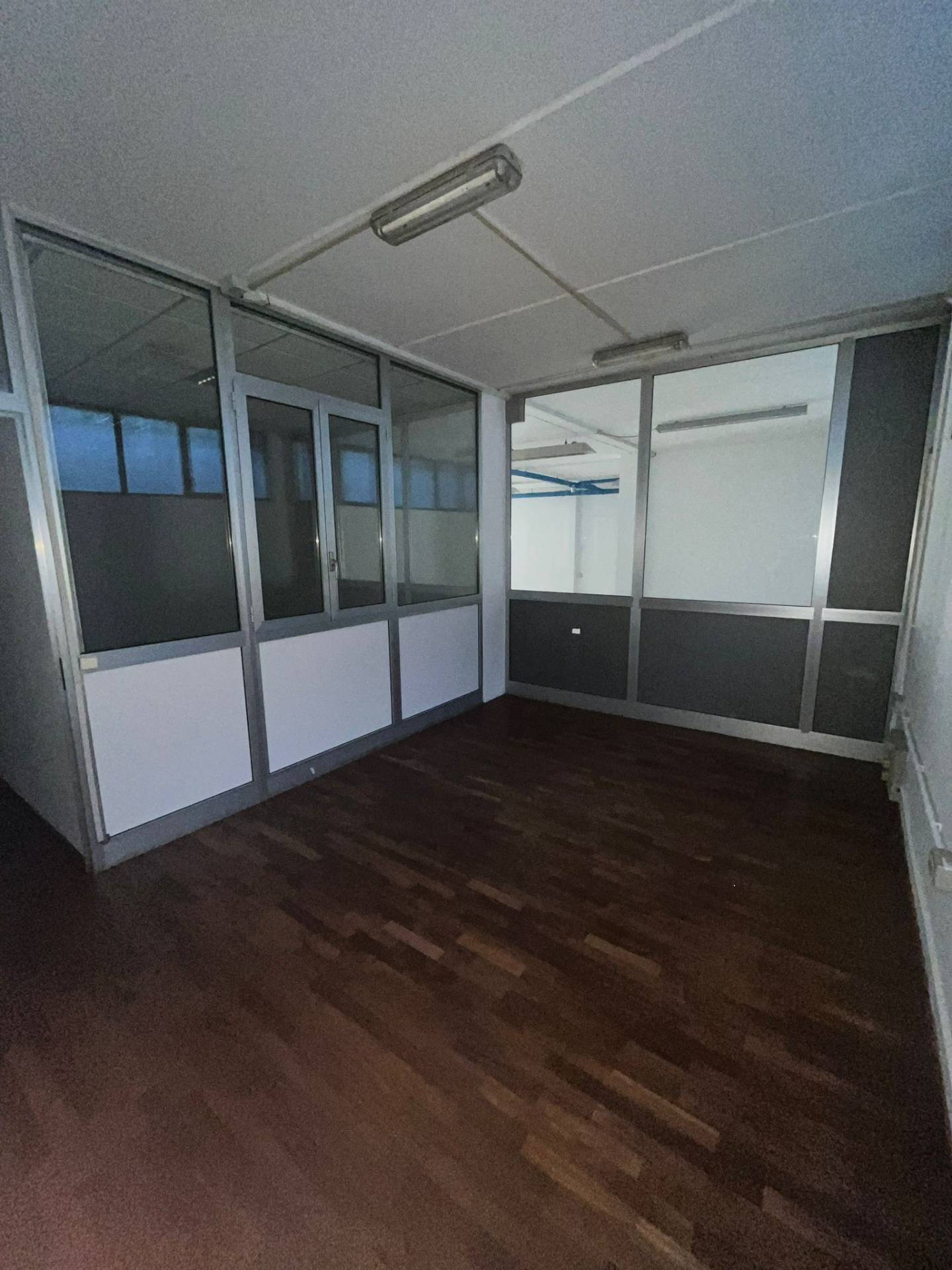Impianto di illuminazione funzionante, pavimentazione in laminato effetto legno in tutto l'open space e negli uffici. I muri divisori sono in cartongesso e sono presenti dei divisori con vetrate.