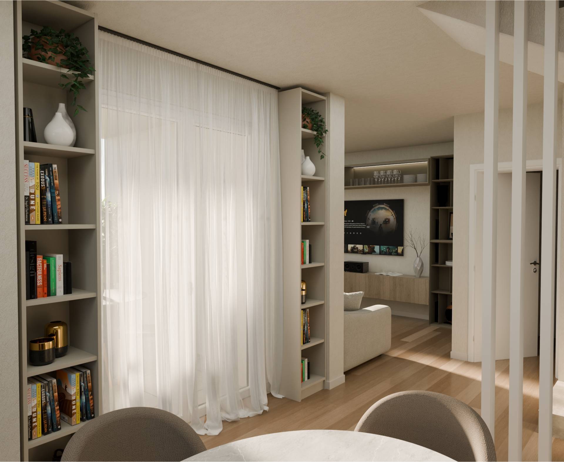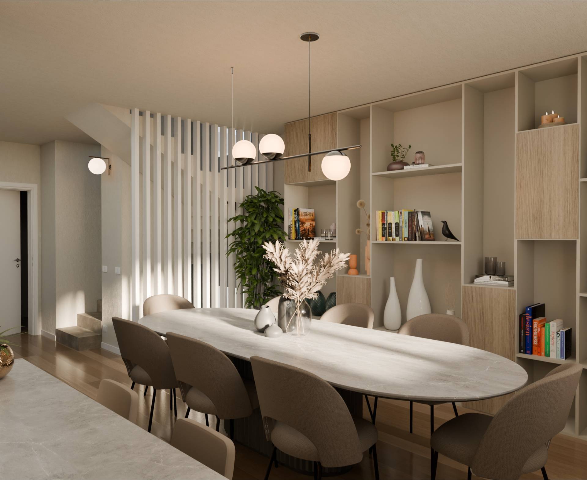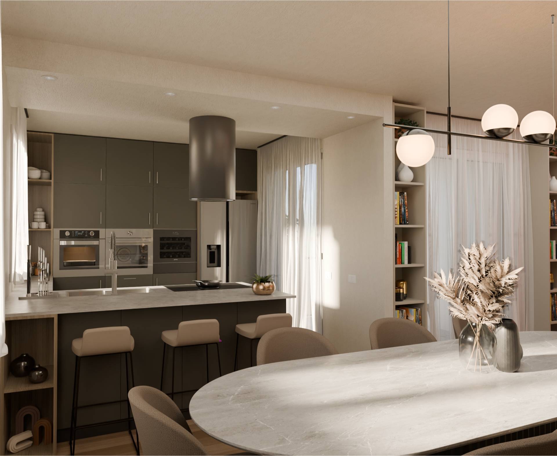 Una volta parcheggiata l'auto si accede direttamente dall'interno dell'abitazione. Dall'ingresso possiamo raggiungere il bagno, la lavanderia e la cantina. Salendo le scale si raggiunge la zona giorno al primo piano dove si sviluppa con una bella sala Open Space con accesso al terrazzo loggiato e alla cucina con isola centrale, anch'essa con accesso al terrazzo. Sempre sullo stesso piano troviamo un pratico bagno ed una stanza che può fungere da zona living, camera degli ospiti o studio.